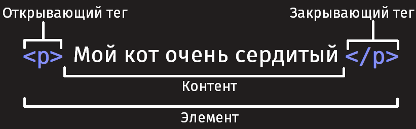 - Открывающий тег: Он состоит из названия (обозначения) элемента (в нашем случае, p), помещённого внутри угловых скобок. Данный тег служит признаком начала элемента, с этого момента тег начинает влиять на следующее после него содержимое.